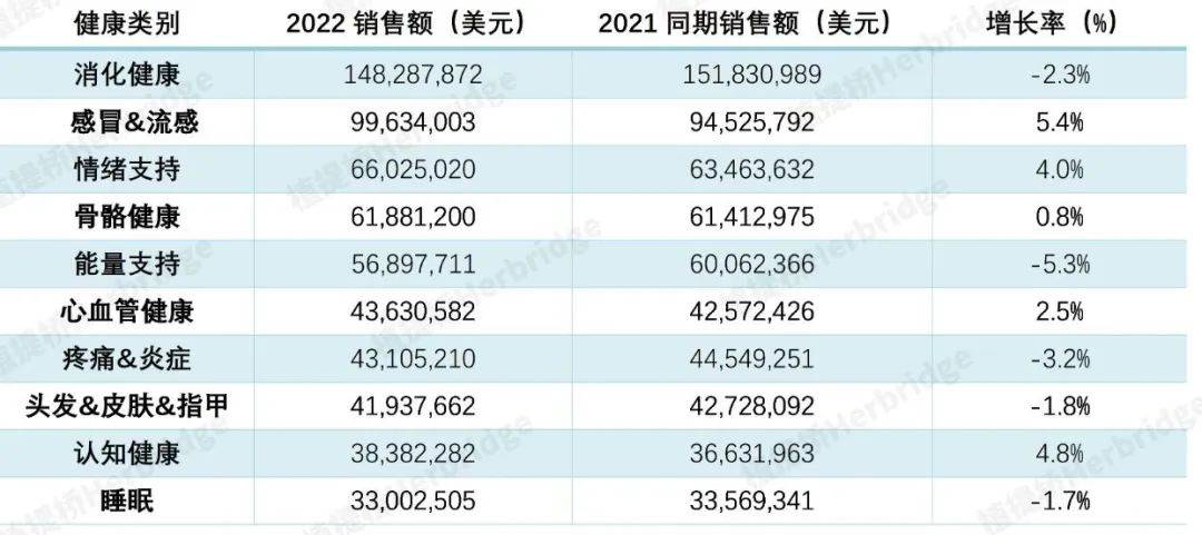 在天然销售渠道中,消化健康、感冒&流感、情绪支持、骨骼健康、能量支持、心血管健康、疼痛&炎症、头发&皮肤&指甲、认知健康、睡眠等十个细分市场的销售额位列前十,这跟2021年的细分市场一致,有变化的是情绪支持销售额从2021年的Top5上升到2022年Top3。