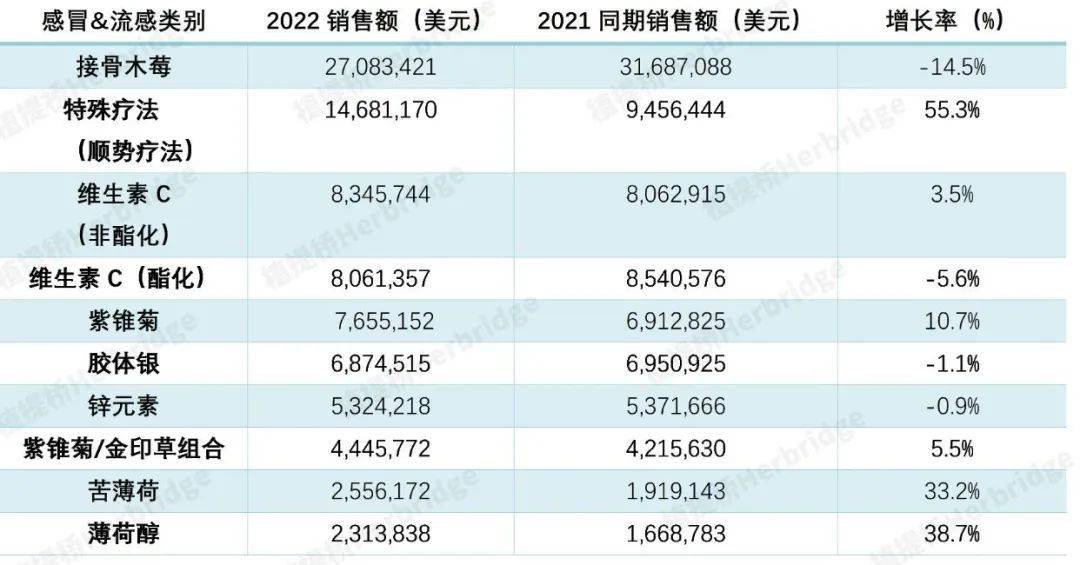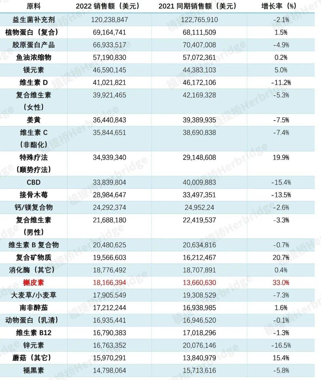 2022年美国天然渠道,槲皮素、蘑菇、复合矿物质等原料增速很快。