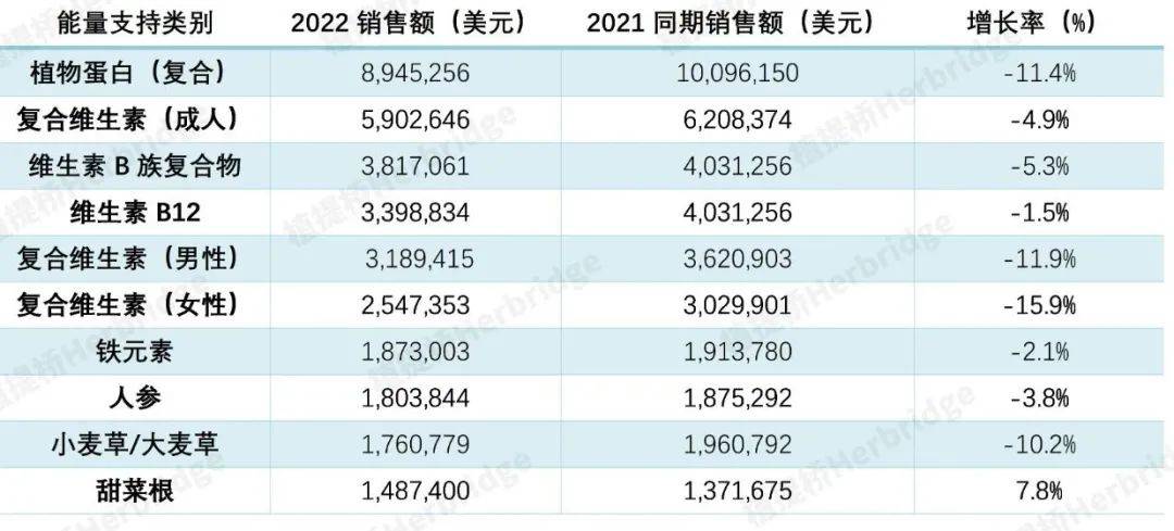 在能量支持类别中,2022年主要原料销售额同比去年都出现下滑,下滑幅度比较高的原料是复合维生素(男性)、复合维生素(女性)、植物蛋白(复合)等,唯一出现增长的原料是甜菜根。甜菜根是铁和叶酸盐的良好来源,在提高耐力方面有一定的市场潜力。同时,甜菜根也是铜、膳食纤维、维生素C、铁和维生素B6的良好来源。