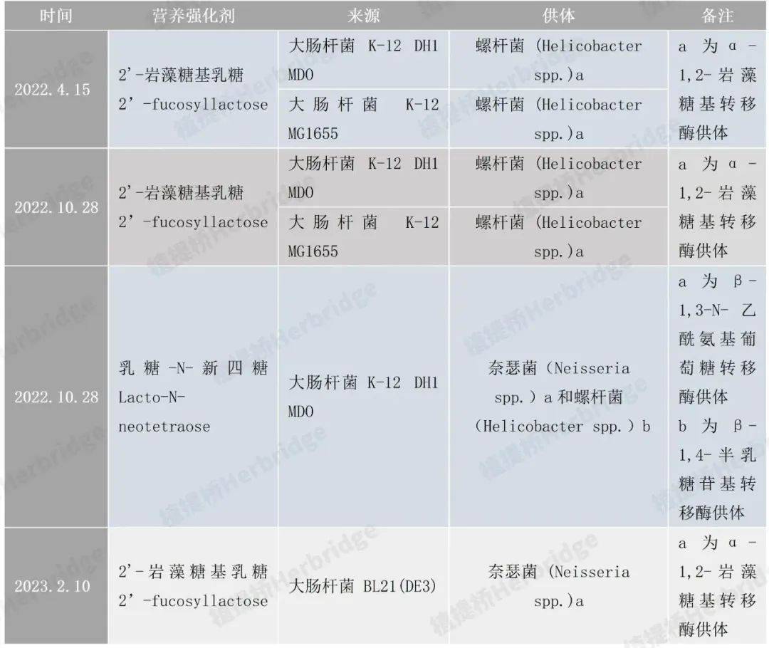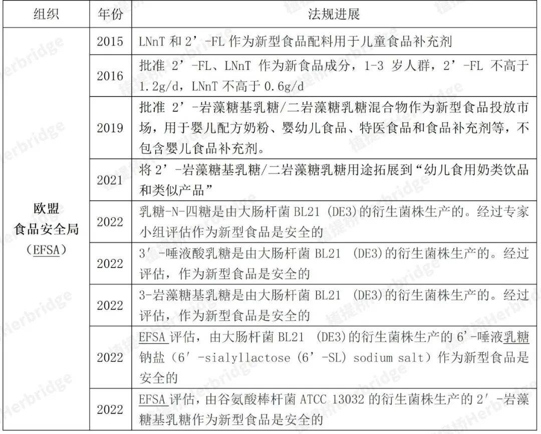 在这两个政策推动,以及申报企业多年来已经做好了充分的准备,今年2’-FL被批准的概率很高。接下来,还会有更多的HMOs成分如乳糖-N-新四糖、3-岩藻糖基乳糖、6’-唾液酸乳糖等会被陆续受理、审批。中国香港、中国台湾地区早先已经通过了2'-FL的监管许可。2021年,中国台湾地区批准2'-FL可应用在婴儿配方食品、较大婴儿配方辅助食品以及7岁以下儿童乳粉或类似产品中,最大使用量1.2克/升,同时还规定了2'-FL的相关生产标准。欧盟对HMOs 中的2'-FL持开放态度,从2015年开始通过了多款HMOs系列成分的安全性评估。★ 2015年,欧洲议会和理事会关于新型食品法规(EU)2015/2283建立的新型食品清单,2'-岩藻糖基乳糖已被批准作为新食品原料(Novel Food),包括合成法来源、转基因大肠杆菌BL21菌株生产来源和转基因大肠杆菌K-12菌株生产来源。★ 2019年11月,欧盟批准2’-岩藻糖基乳糖/二岩藻糖乳糖混合物作为新型食品投放市场。★ 2022年更是加速HMOs多款成分作为新型食品的安全评估。表4:2'-FL、LNnT等在欧盟的监管许可情况信息
