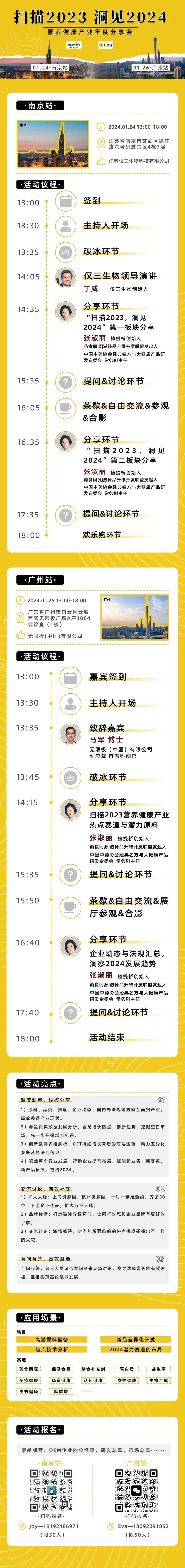 扫描2023·洞见2024丨营养健康产业扫描年度分享会将再度起航,于1月24日/南京,1月26日/广州分别举办!期待能够为南京地区和广州地区的行业同仁提供更多从多个维度进行差异化创新的灵感与方向,帮助企业更好的布局2024。