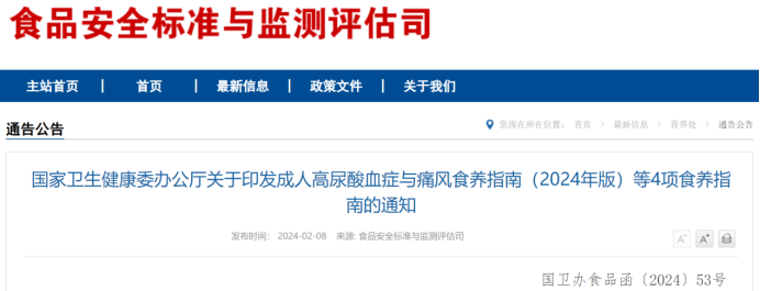 2月8日,国家卫生健康委办公厅正式发布《成人高尿酸血症与痛风食养指南(2024年版)》、《成人肥胖食养指南(2024年版)》、《儿童青少年肥胖食养指南(2024年版)》、《成人慢性肾脏病食养指南(2024年版)》等4项食养指南。
