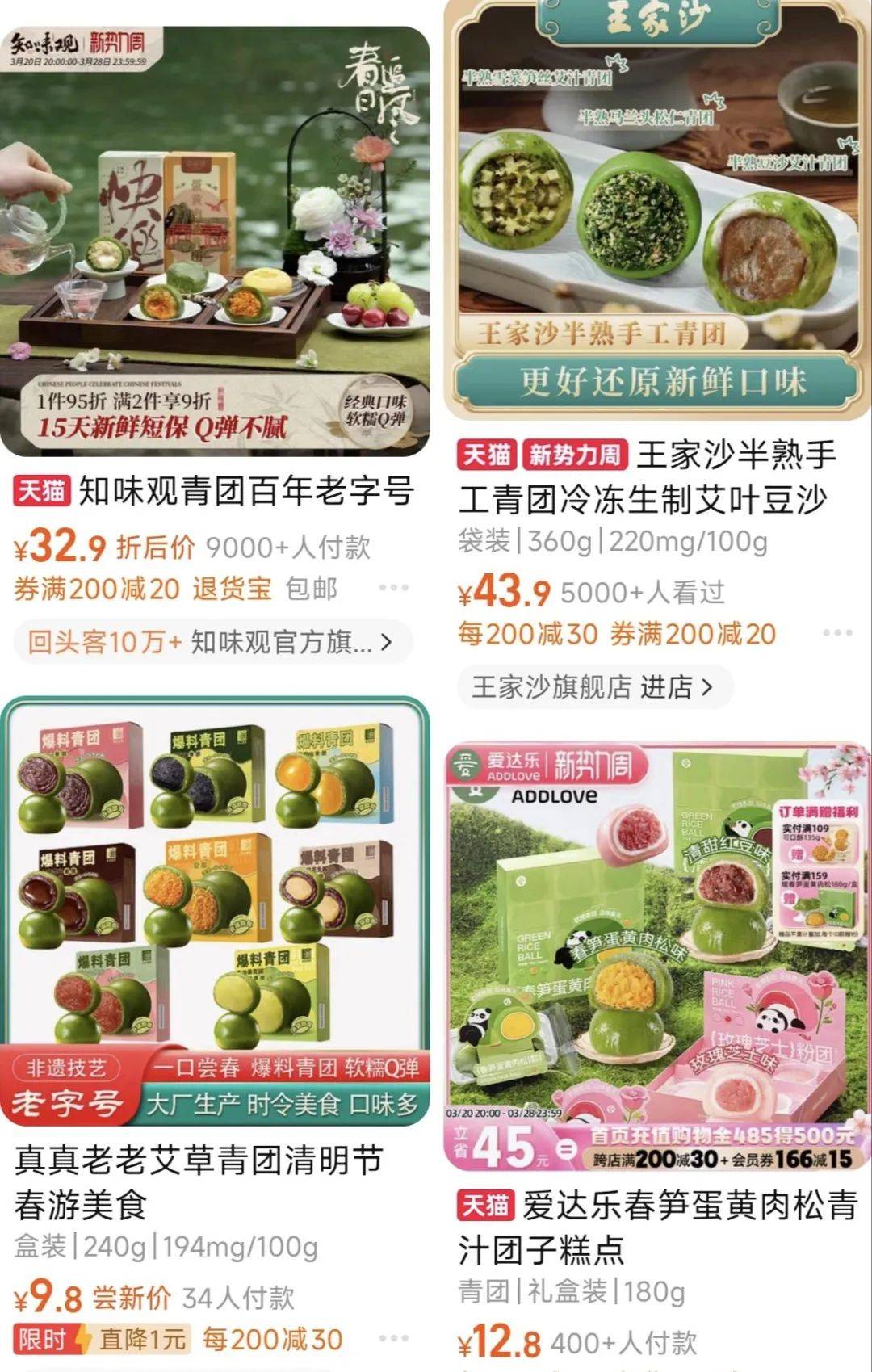 线上渠道的拓展进一步加速了这一趋势——电商平台推出“全家福组合”,融合传统豆沙与创新口味,覆盖更广泛的年轻用户,推动青团从“清明限定”向“四季常青”转型。青团这一品类正在努力冲破节令爆发的桎梏,竭力向日常畅销的方向迈进。