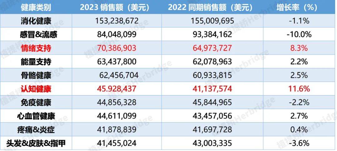 在天然强化渠道中,和2022年相比睡眠健康已经不在Top10健康类别,新进入的玩家是“免疫健康”,虽然免疫健康市场销售额出现下滑,但销售额达4400万美元,超过睡眠健康。同时,增长比较明显的健康类别分别是情绪支持和认知健康,市场增幅分别为8.3%和11.6%。