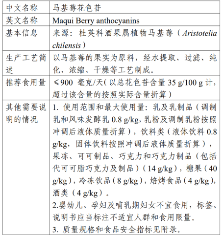 本申报产品马基莓花色苷是从马基莓的果实中经提取、分离的成分(总花色苷≥35%)。本产品推荐食用量≤900 毫克/天(以总花色苷含量35g/100g计,超过该含量的按照实际含量折算)。