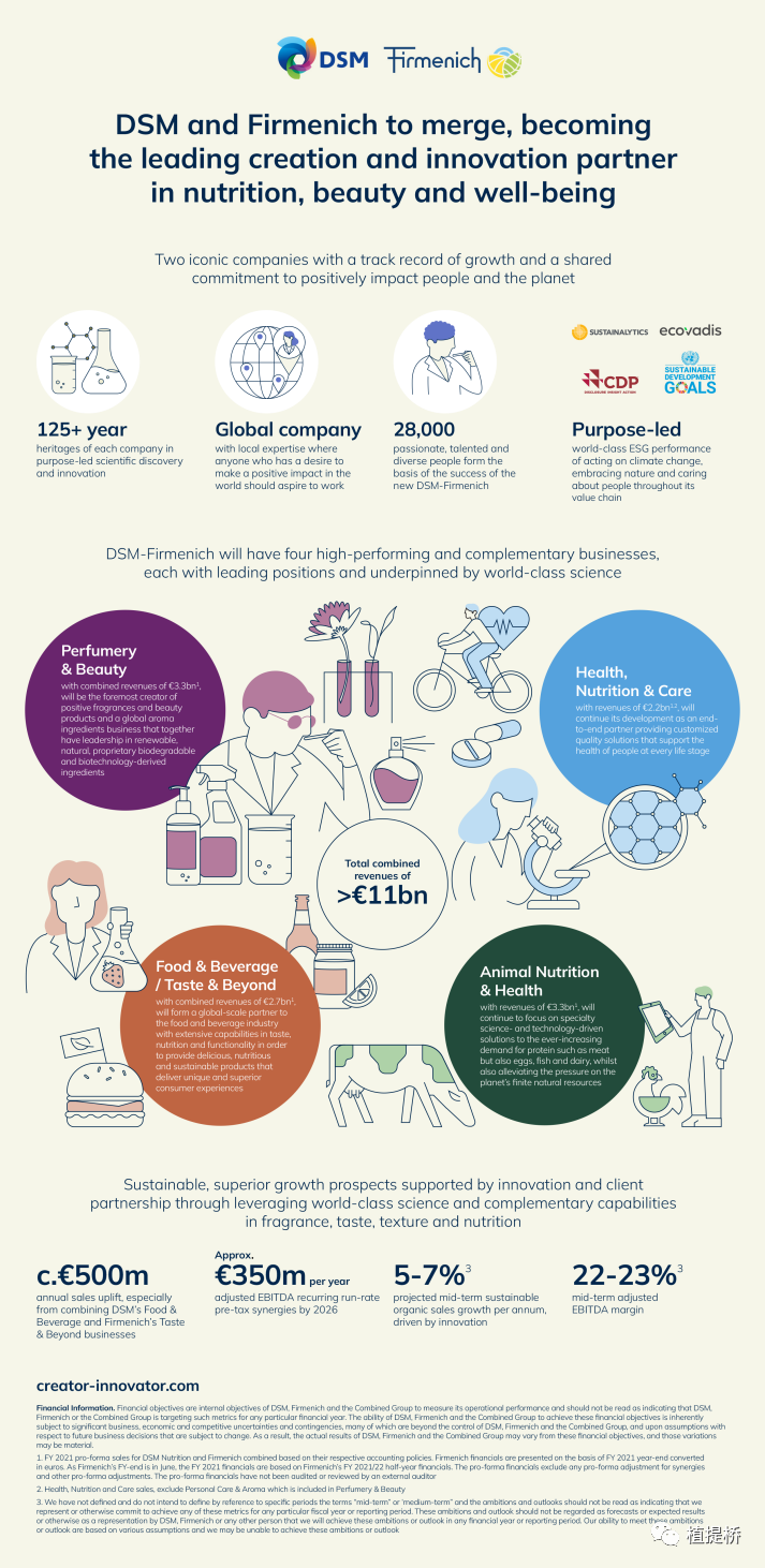 5月31日,芬美意官方宣布,与全球知名企业帝斯曼DSM正在合并。两家企业合并之后,帝斯曼股东拥有公司65.5%的股份,芬美意股东占据34.5%的股份,后者还将获得35亿欧元现金。合并后的新公司名为DSM-Firmenich,将正式成为瑞士公司,公司设有两个总部:一个在瑞士的Kaiseraugst,一个在Maastricht。两家公司宣布将共同成为营养、美容和健康领域领先且具有创新能力的企业。DSM-Firmenich由两位老板管理:Geraldine Matchett和Dimitri de Vreeze。帝斯曼的两位联席CEO将继续担任新公司的这一职位。董事会则由现任帝斯曼董事长Thomas Leysen担任。芬美意总裁Patrick Firmenich将担任该公司副总裁。对于本次收购,DSM和芬美意的领导层都发表了相关看法。帝斯曼监事会主席Thomas Leysen表示,双方将携手合作,更好地满足客户需求。DSM监事会认为,这是一次符合所有利益相关者利益的合并。芬美意总裁Patrick Firmenich表示,高度互补的能力,将会加速新公司的发展。DSM-Firmenich将拥有四个领先且互补的业务领域:1、美容领域总收入为33亿欧元。其将成为香料与美容产品的创造者,同时也拥有可持续的、天然的、专利生物降解和生物技术衍生原料等技术。2、健康、营养及护理方向收入为220亿欧元。其将继续面向B端企业,成为它们的合作伙伴,为企业们提供定制化、高质量的解决方案,支持不同年龄段用户的健康需求。3、食品及饮料领域收入为2.7亿欧元。同样致力于成为全球食品饮料行业的供应商。为企业提供美味、营养且可持续的产品,为消费者提供独特出众的消费体验。该公司表示,在口味、营养和功能方面具有多元的能力。4、动物营养及健康方向收入为3.3亿欧元。未来DSM-Firmenich还将技术专注于科技助力下的解决方案提供,满足市场对不断增长的对蛋白质补充的需求,比如肉类、蛋类、鱼类、奶制品等。并希望以此减轻地球资源有限的压力。DSM除了与芬美意合并之外,其还出售工程材料业务给Advent International和朗盛,交易金额为38.5亿欧元。将彻底转变为专注于健康、营养和生物科学领域的企业。