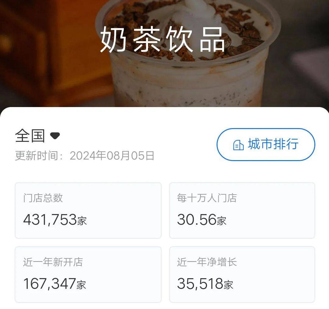 窄门餐眼的数据显示,(截至8月5日)全国奶茶门店总数为431753家,近一年新开门店数超16.7万家,净增长3.5万家,意味着一年13万家奶茶店消失,平均每天有350多个经营者离场。
