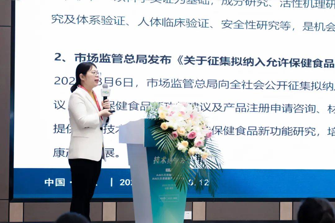 翟巧丽分享了《法规创新与政策驱动下的营养健康产业》,她讲到目前国内政策不断完善,如新食品原料、药食同源等快速增加原料名单;保健食品新功能申报及开通糖果保健食品剂型等一些列政策,为功能食品开发提供了有利契机。同时,科技推动营养健康产业在不断创新。如营养品牌与健康平台的合作,AI技术助力诊疗一体,提供专业问询和个性化营养补充方案等。