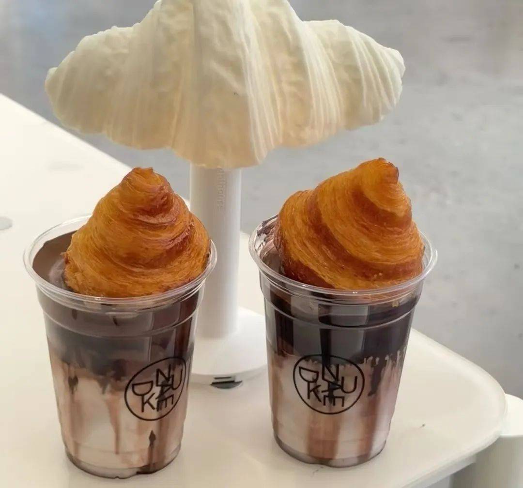 其实这种产品形式今年年初就有了,韩国知名烘焙品牌NUDAKE推出过一款可颂巧克力拿铁:一整个迷你可颂一半都浸在顶部的巧克力酱中,外观十分诱人,一推出就卖爆了。
