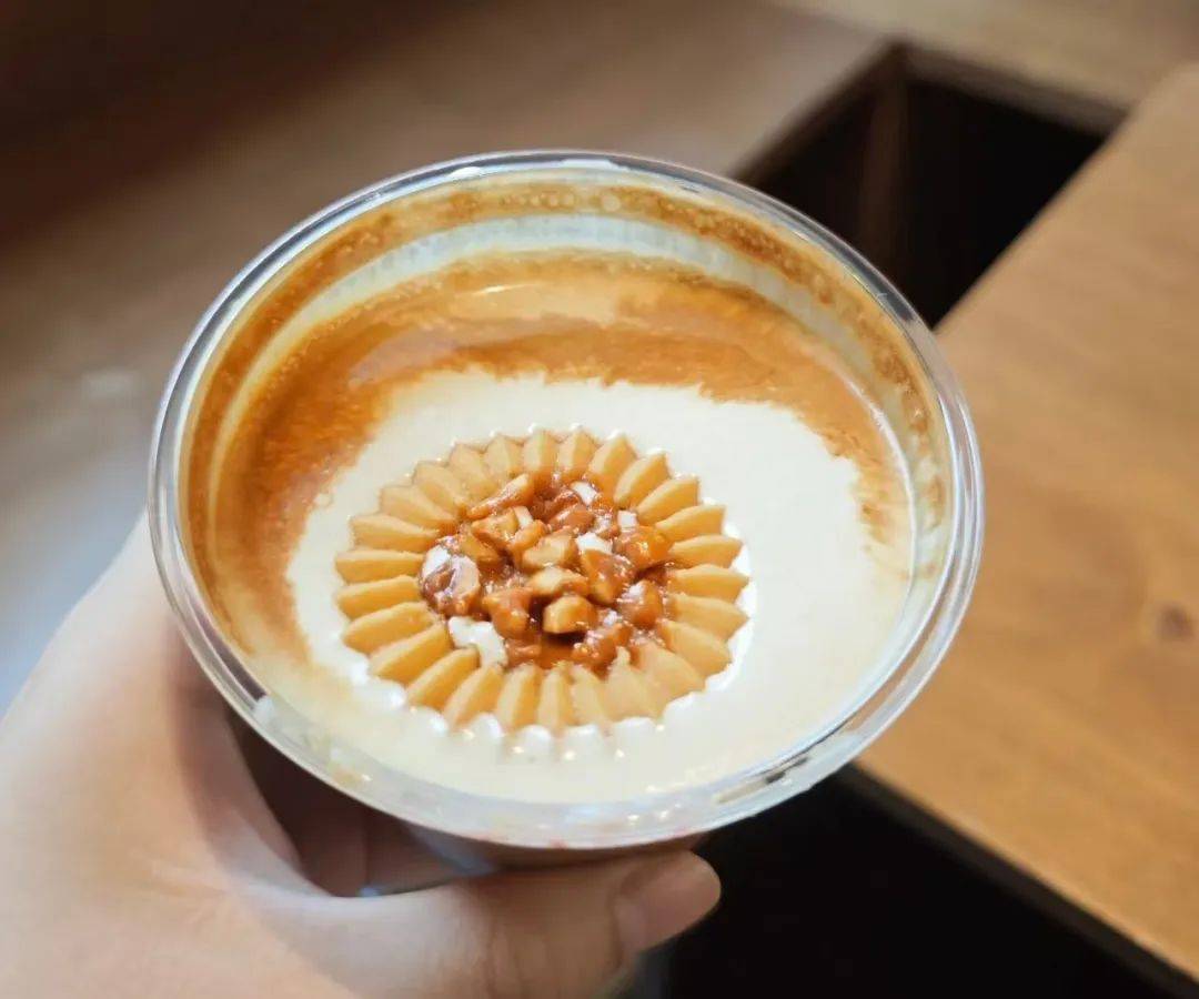 比如杭州鄰居neighborhood coffee的咸花生厚乳拿铁,在醇厚的dirty基底上,搭配花生风味奶盖,顶部点缀焦糖花生饼干,网友评:“比直接饮用一杯风味拿铁多了咀嚼感和满足感”。
