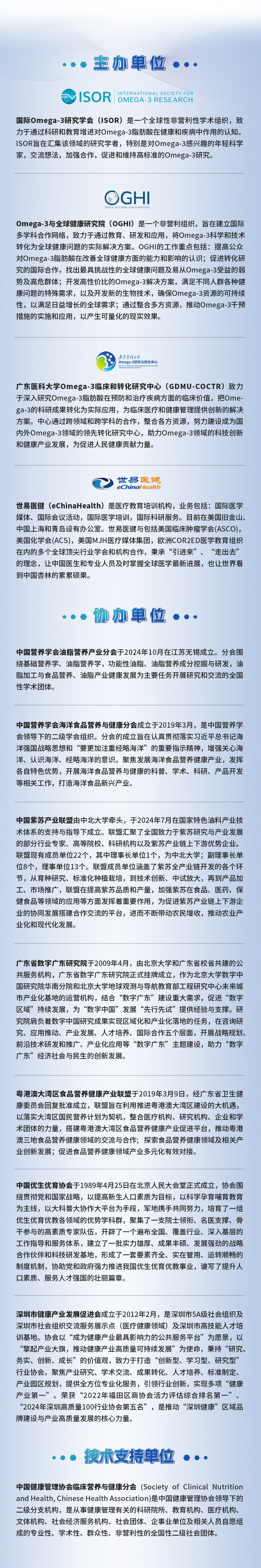 由国际Omega-3研究学会(ISOR)、Omega-3与全球健康研究院(OGHI)、广东医科大学Omega-3临床和转化研究中心(GDMU-COCTR)、世易医健(eChinaHealth)主办,中国营养学会油脂营养产业分会、中国营养学会海洋食品营养与健康分会、中国紫苏产业联盟 、广东省数字广东研究院、粤港澳大湾区食品营养健康产业联盟、中国优生优育协会和深圳市健康产业发展促进会协办,中国健康管理协会临床营养与健康分会技术支持的“2025国际Omega-3科技与产业大会”将于12月12—13日在充满创新活力的粤港澳大湾区、风景优美的东莞松山湖凯悦酒店盛大举行。科研领军人、临床先锋者、产业中坚力等新、老伙伴将再度携手,共聚莞城!