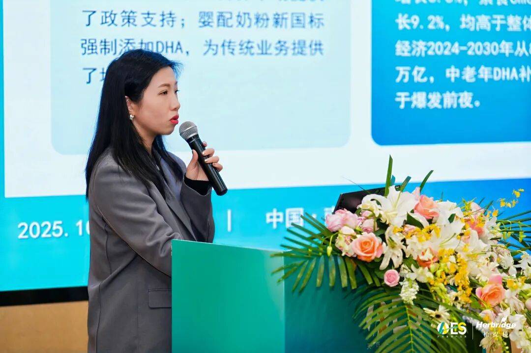 嘉必优生物技术(武汉)股份有限公司海外市场品牌经理徐瑞分享《守护银龄健康新核心:藻油DHA的心脑眼全面保护方案》,全球及中国老龄化进程加快,银发经济规模持续扩大。中国老龄化呈现“速度快、规模大、未富先老”特征,嘉必优围绕DHA在心、脑、眼健康中的全面保护作用,推出“营养君®DHA藻油软胶囊”,每粒含450mg DHA,含量为市面同类2–3倍。其藻油原料纯净,拥有多项国际认证(如FDA GRAS、欧盟Novel Food)。嘉必优作为合成生物学领域先锋企业之一,有完整技术平台与完备质量体系,用其高含量、高品质的DHA藻油产品,为中老年人群提供科学、安心的健康支持。