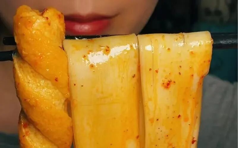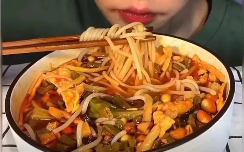 红油辣椒加麻酱,混合着软软糯糯的土豆宽粉,每一口,都让看客跟着咽口水。