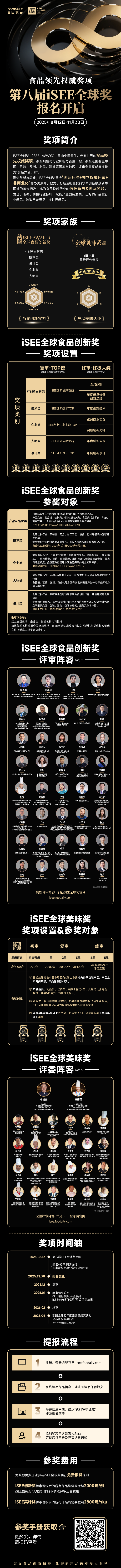 第八届iSEE全球奖也将继续秉承“彰显食品创新精神,让好的产品被更多人看见”的奖项使命,携手创新&美味标杆一起发声,放大奖项背书价值,赢取市场信任先机,链接行业优质资源,拉动品牌价值和增长潜力,共同引领产业变局!