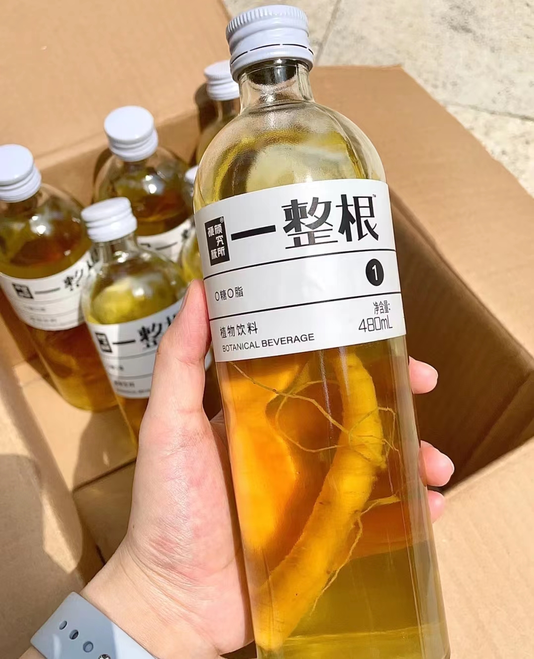 这是一瓶以人参为主原料的植物饮料。一整根人参被清晰可见地放在了既简约又高档的玻璃瓶中,并与杭白菊、茉莉花等配料制作而成的淡黄色液体融为一体,不禁让人联想到了“大补”和“养生”。