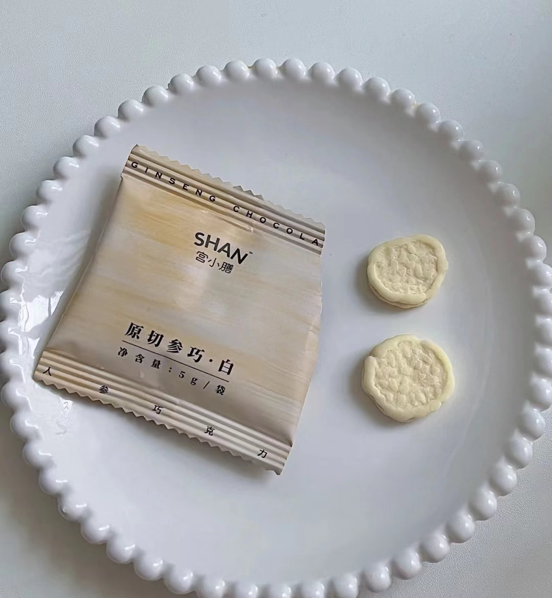 巧克力人参采取的是冻干技术,0%的白砂糖冻干人参外被一层巧克力包裹,嚼起来是饼干的口感,当味道突破了人参的固有定义时,口感也变得新奇了,新的CP“巧克力+人参”就此诞生。