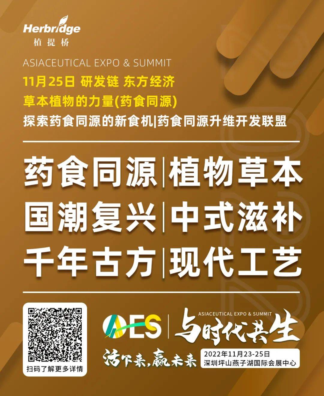 养生目前已经深入年轻人的日常生活中, 满足年轻群体对滋补营养的需求。但其实不止人参,还有许多的药食同源物质具有非常大的开发空间,那么药食同源都有哪些新玩法?药食同源产品开发都有哪些亮点? 由植提桥主办的AAES2022天然健康产品行业大会11月25日研发链板块——东方经济,草本植物的力量(药食同源)主题论坛上,BuffX、江中药业、燕之屋、一整根、春风食养局等一众大咖将会进行深度分享。