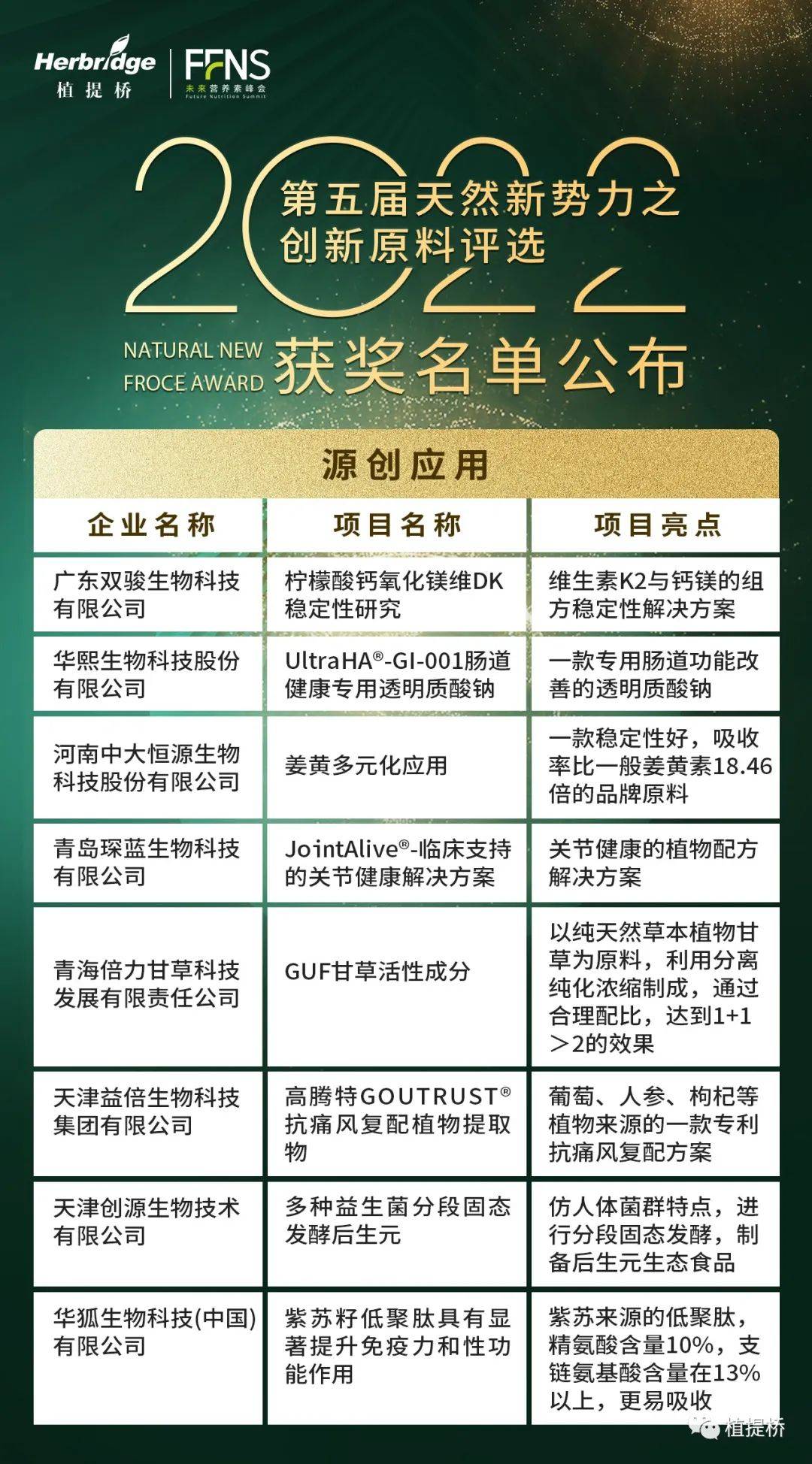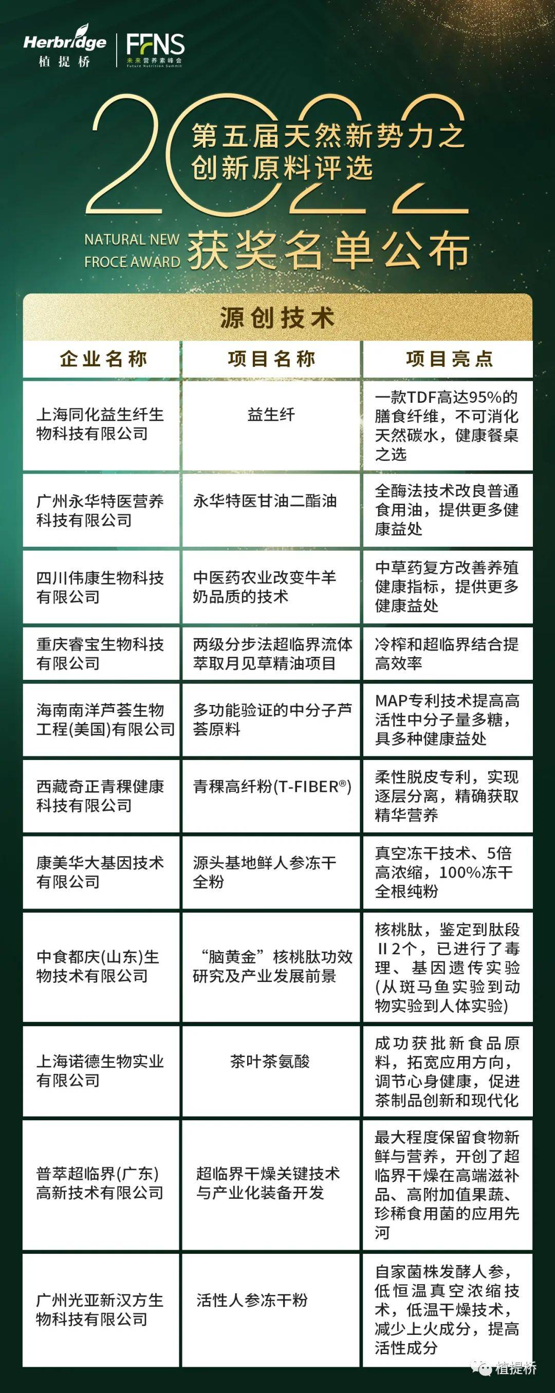 秉承“为品牌商创新研发项目赋能、为天然健康产业增添新力量、为资本方寻求未来独角兽”的活动方针,经过海选、评审等多轮缜密评选,我们最终评选出: