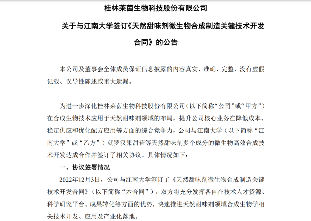 2、莱茵生物联合江南大学,布局生物合成天然甜味剂;
