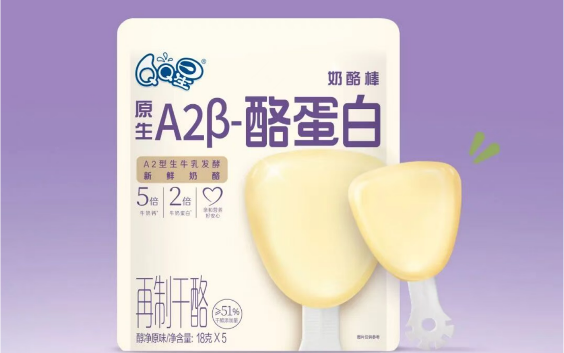 9月2日,伊利QQ星上新奶酪棒新品原生A2β-酪蛋白,该产品使用A2型生牛乳限时发酵而成,原生自带A2β-酪蛋白,配料表只添加奶酪、蛋白配料、水、海藻糖、柠檬酸钠,无防腐剂和食品用香精等,适合儿童在户外、家庭等多种场景食用。