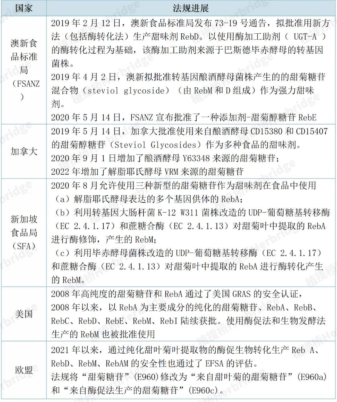 对于Reb系列单一成分,美国、澳新、加拿大、新加坡等国都不同程度批准采用酶发酵法、基因工程菌合成法获得的产品合规化。