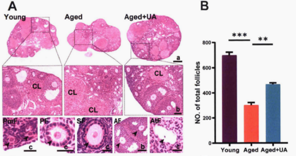 国内研究团队郑州大学第一附属医院生殖医学中心就开展了一项关于天然化合物尿石素A在生殖健康方向的小鼠实验研究。其采用8月龄的雌性小鼠(相当于人类的高龄阶段)随机分成两组,一组通过灌胃给予尿石素A,另一组给予安慰剂,试验周期为12周。