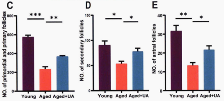 研究发现,补充尿石素A组的老龄雌鼠的平均产仔数有所增加,同时在动情周期、各级卵泡数量、卵母细胞的数量与质量等方面相较于安慰剂组都有所提升。