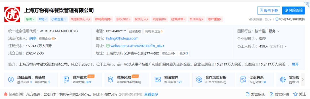 2023年9月以来,虎头局关联公司上海万物有样餐饮管理有限公司已经新增多则被执行人信息,总被执行金额达533.47万元。其中最高的一笔出现在1月8日,执行标的171万余元,涉及买卖合同纠纷案件,执行法院为上海市闵行区人民法院。