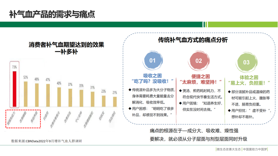 尽管气血健康需求旺盛,但传统补气血方式存在很多痛点。一是“吸收之困”,传统滋补品多为大分子物质,身体需耗费大量能量分解消化,吸收效率低,不少用户反馈“吃了却没效果”;二是“便捷之困”,煲汤、煎药耗时耗力,不符合现代快节奏生活,导致用户“想养生却没时间坚持”;三是“体验之困”,部分滋腻补品或温燥药材易引起不适及肠胃负担,让用户陷入“虚不受补,想补不敢补”的困境。这些痛点的根源,在于传统气血产品成分分子大、吸收难、燥性强,要解决问题,须从分子层面与剂型层面同时升级。