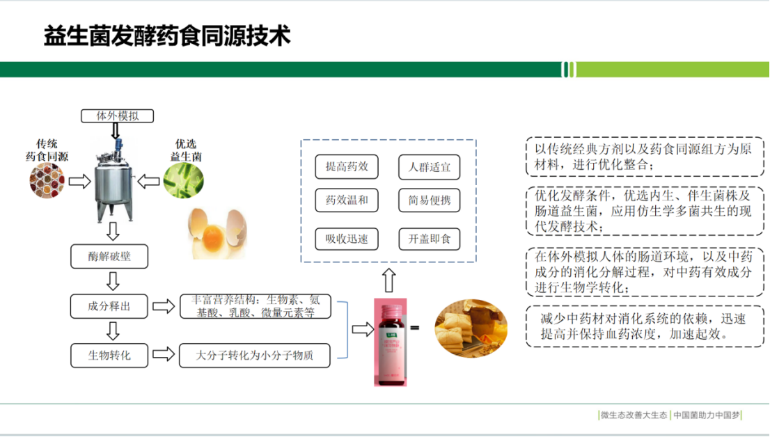 具体而言,益生菌发酵药食同源技术遵循“体外模拟”的思路:以传统经典方剂及药食同源组方为原材料优化整合,优选内生、伴生菌株及肠道益生菌,应用仿生学多菌共生现代发酵技术,在体外模拟人体肠道环境与中药成分消化分解过程,对中药有效成分进行生物学转化。这一过程实现了大分子物质向小分子物质的转化,丰富了营养结构(生成生物素、氨基酸、乳酸等),最终使产品具备效果提升、吸收提升、人群适宜、效果温和、简易便携、开盖即食等优势。
