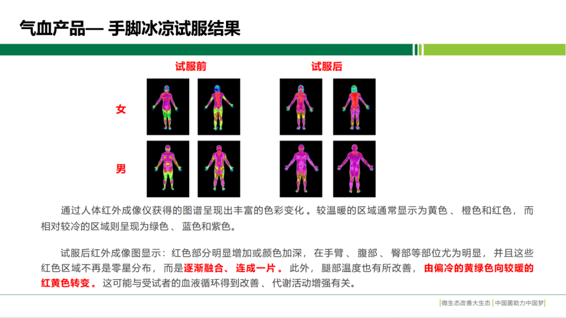 为进一步验证效果,一然生物开展了人群试服实验,参与人数221人,试服周期30天,服用方法为早晚各1支(30mL/支)。221人试服2周后,皮肤方面的影响为81%、睡眠方面为87%、精神状态等其他方面为89%;61人试服4周后,月经影响为89%。针对手脚冰凉人群,21位受试者参与专项试服,通过人体红外成像仪观察发现,试服后红色温暖区域明显增加或颜色加深。