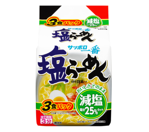 サッポロ一番減塩塩ラーメン一款低盐加风味的健康速食产品,其盐含量减少了25%。据悉,产品的面条形状圆润,口感滑顺,柔韧有嚼劲,产品的汤料以鸡肉和猪肉的鲜美为基础,巧妙地将洋葱、大蒜、调味蔬菜和香料进行均衡搭配,从而降低了盐分的添加。