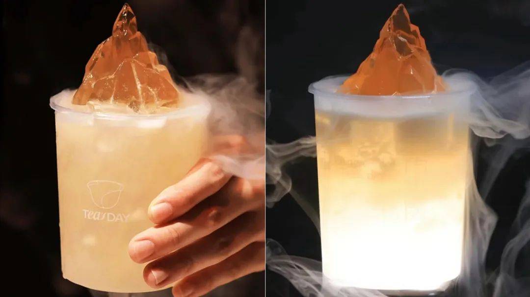 Teaday时下有茶用海石花做成山峰形状的茶冻,搭配黄皮原汁与铁观音茶底,最后在顶部用烟雾枪打出一个白色泡泡,烟雾萦绕,营造出“日照金山”的氛围感。