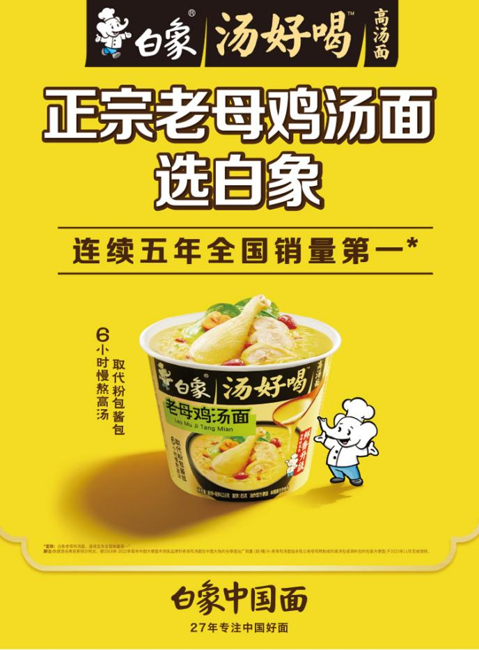 对国人消费需求的精准洞察和产品品质的坚持,也让白象汤好喝一直在市场上占据着高汤面品类的“头把交椅”:据欧睿咨询数据,按2022年中国大陆各系列全渠道销售量(份)计算,白象“汤好喝”成为高汤方便面中国销量第一;另据咨询机构弗若斯特沙利文去年11月的调研显示,白象“汤好喝”的代表产品老母鸡汤面更是连续五年全国销量第一。