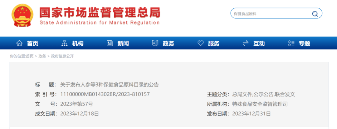 2023年12月31日,国家卫健委联合、卫生健康委、中医药管理局三部门联合发布人参、西洋参、灵芝3种保健食品原料目录的公告,自2024年5月1日起施行。