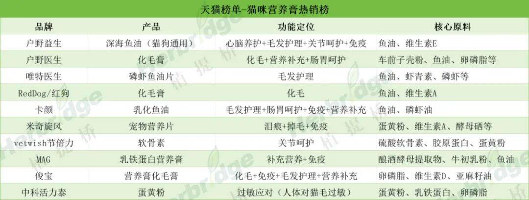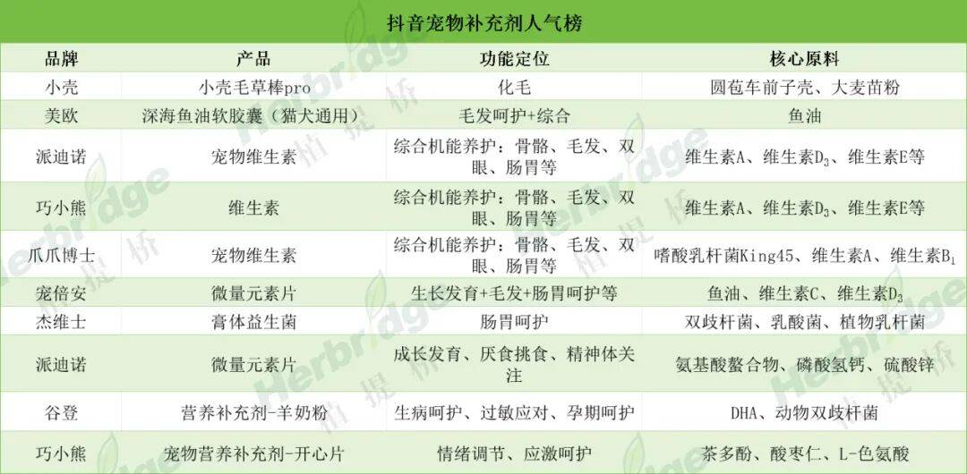 植提桥整理了抖音平台与天猫平台宠物补剂热门产品榜单也可以看到,宠物营养品的核心功能与消费诉求主要为4大方向: