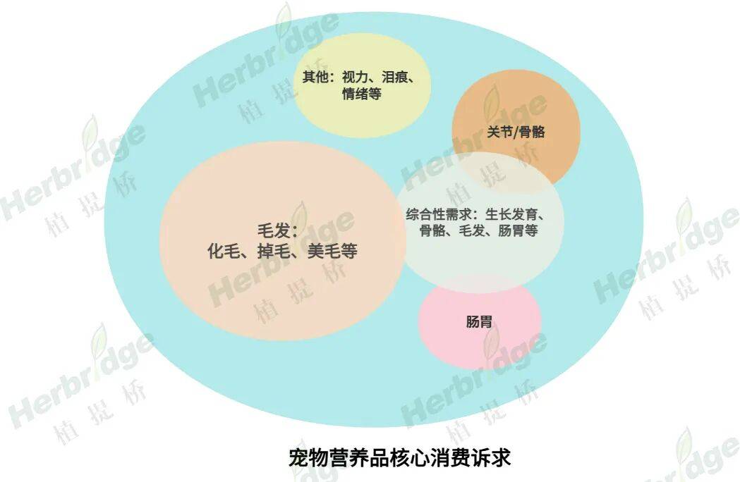 综合性需求:包括成长发育、骨骼强壮、毛发、肠胃等。目前此类主打综合性功能的产品是热门产品的主力军。