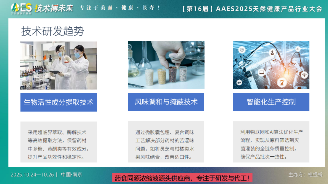 技术研发创新驱动。技术升级创新为产品研发带来了新的可能。在提取方面,生物活性成分提取物技术(超临界萃取、酶解技术)等,可以更好保留药食同源物质中的功效成分、优化产品的功效和稳定性;在风味口感方面,风味调和与掩蔽技术,如微胶囊包埋、复合调味工艺等,能够很好地优化平衡药材本身的苦涩味,改善产品的适口性等。而在生产环节,技术也在改变整个生产流程,通过智能化生产控制,如利用物联网和AI算法优化生产流程,确保产品批次的一致性,强化产品全链条生产的质量控制。