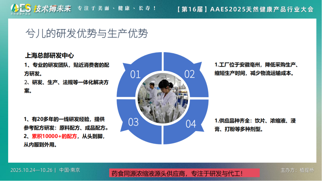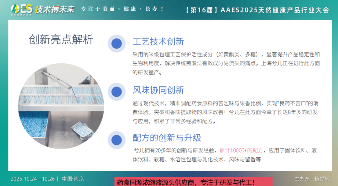 结合实战经验,胡总重点介绍了兮儿在药食同源饮品创新开发的三大亮点:其一、在技术工艺创新上,纳米级包埋工艺能够显著提升产品的稳定性和生物利用度,解决了传统煎煮有效成分易流失的痛点。其二,风味协同创新上,胡总强调,兮儿在风味协同上深耕了8年的研发与应用,积累了丰富的经验和配方,能够通过现代技术,实现“良药不苦口”的消费体验。其三,配方的创新与升级,他介绍,兮儿拥有20多年的创新与研发经验,积累10000+配方,有信心为市场创新提供扎实可靠的服务。