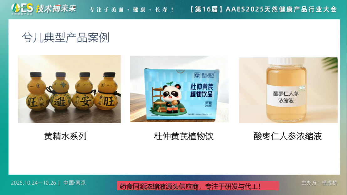 同时,他还带来多款兮儿在药食同源产品方面的创新案例,覆盖品类众多:饮料、膏滋、饼干、粉剂、固体饮料、中药咸菜等。在药食同源饮品方面,展示了黄精水系列、杜仲黄芪植物饮、酸枣仁人参浓缩液、肉桂小黄姜饮、山楂陈皮消食饮等。此外还展示了兮儿针对女性群体研发的地黄培元膏;爽口黄精咸菜等产品。