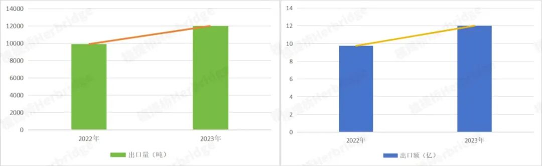 枸杞作为我国传统的药食同源物质,具有广泛消费认知度。据海关总署的数据,2023年中国枸杞出口量达到1.2万吨,比2022年增加了21.2%;枸杞出口额达到12亿美元,比2022年增加了23.1%。从市场规模来看,目前枸杞的国内市场规模在百亿级别。随着药食同源的崛起,枸杞在未来的中国市场乃至全球市场仍有很大的发展潜力。