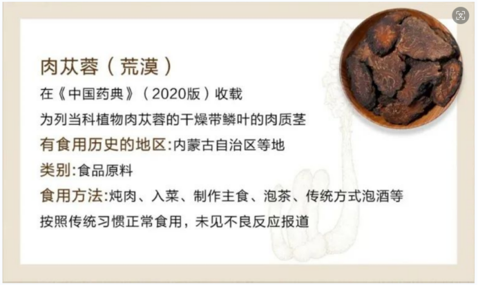 2023年11月,国家卫健委和国家市场监管总局联合发布公告,肉苁蓉(荒漠)和党参、铁皮石斛等其他9种物质,纳入按照传统既是食品又是中药材的物质目录,意味着肉苁蓉拥有了食品和中药材的“双重身份”。