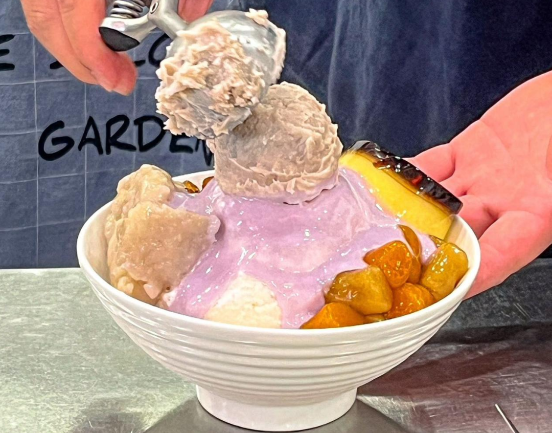 绵密的米乳冰打底,上面盖着芋泥浇头、大芋圆、芋头块、马蹄粉圆和圆布丁,顶部还有一个大大的芋泥球。