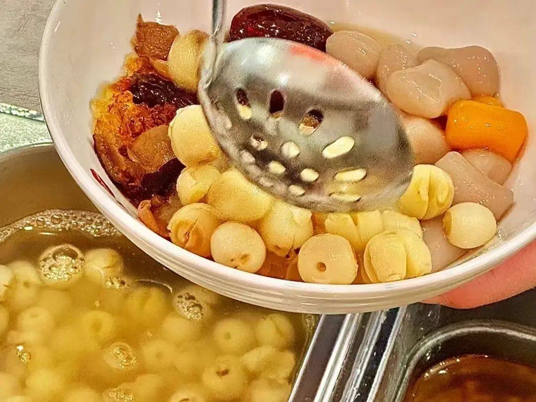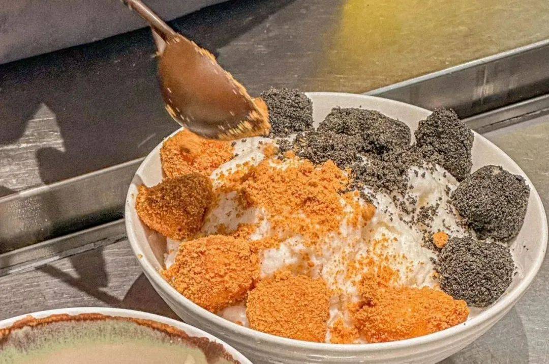 挖一大勺入口,淡淡的米香混合芋头香味,清爽细腻,小料Q弹爽滑、口感层次丰富。