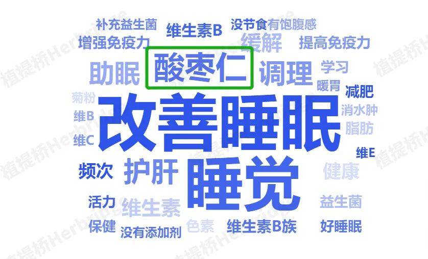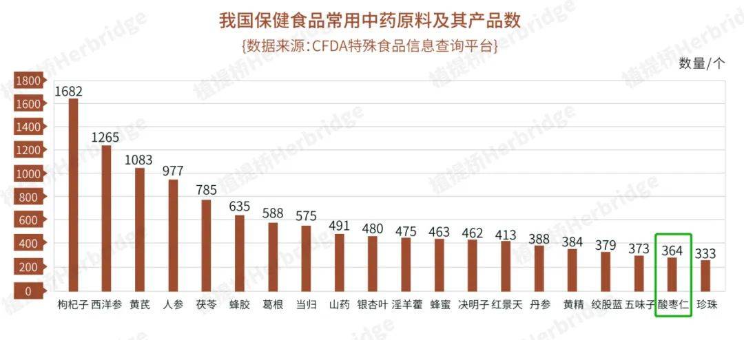 药食同源近年来在消费端越来越流行,加上消费市场对于睡眠的需求越来鲜明,催生了睡眠产品的机会到来。据植提桥的《药食同源产业洞察报告》的数据显示,我国保健食品常用中药原料及其产品数中酸枣仁数量到364款,终端应用市场的应用热度较高。