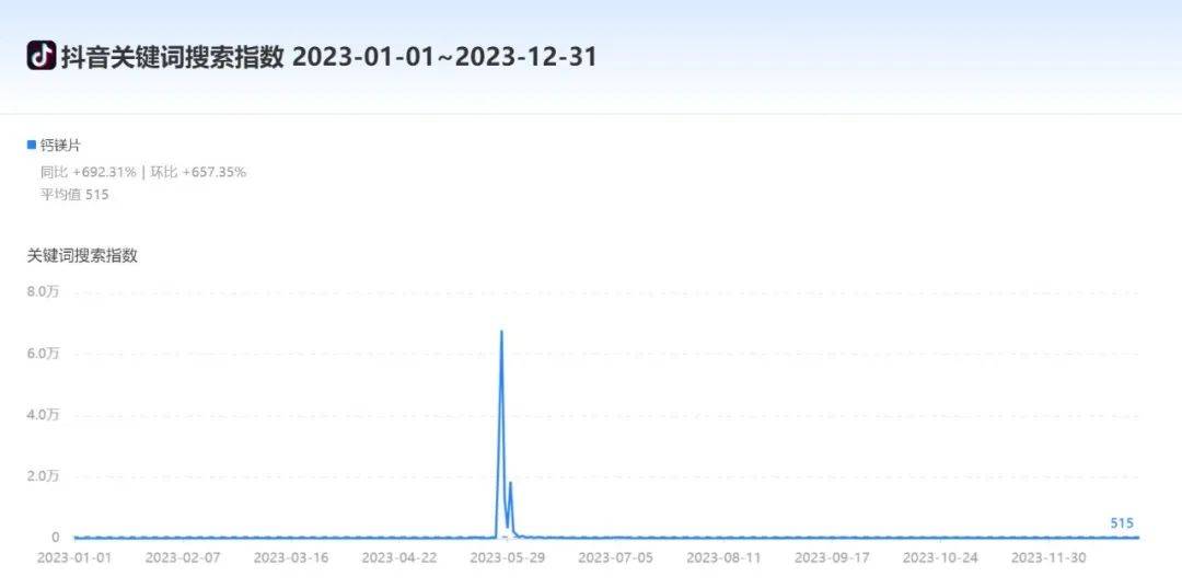 在消费者认知端,对于镁的认知也在不断增长。以抖音关键词搜索指数为例,关于【钙镁片】的搜索指数在2023年同比增长692.31%;环比增长657.35%。【缺镁】的关键搜索指数在2023年同比增长101.25%,环比增长75%。
