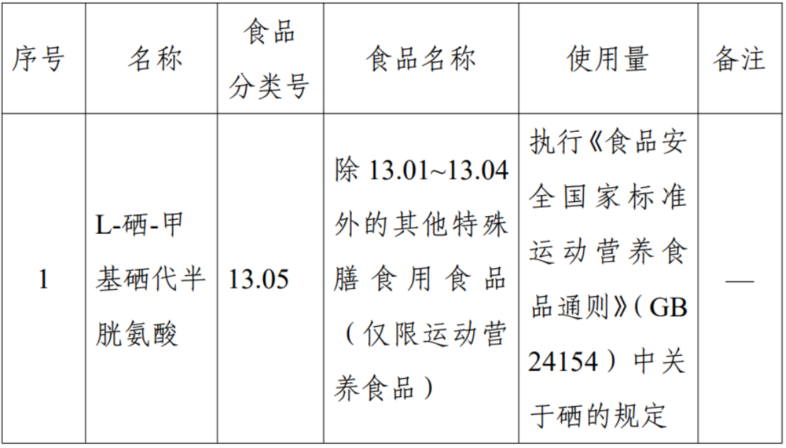 本次L-硒-甲基硒代半胱氨酸申请扩大使用范围用于除 13.01~13.04 外的其他特殊膳食用食品(仅限运动营养食品)(食品类别 13.05),契合运动营养食品对精准营养补充的需求,助力运动营养食品产业的精细化升级。