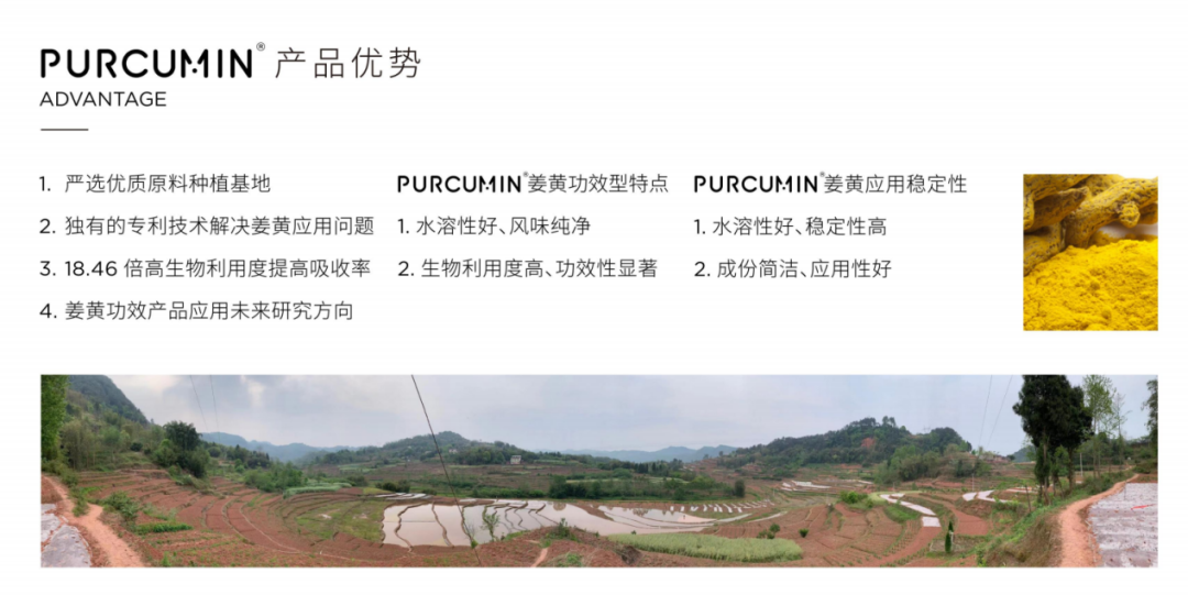 中大恒源多年来一直致力于姜黄的深入研究,严选优质原料种植基地,并利用独有专利技术自主研发了水溶性好、风味纯净、稳定性高、拥有18.46倍高生物利用度的产品PURCUMIN®。