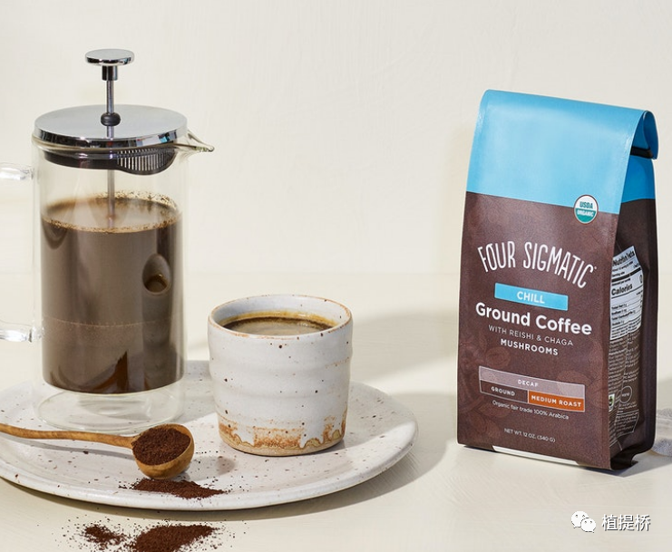 在零售市场渠道中,蘑菇咖啡是比较有代表性的产品。Four Sigmatic推出的Chill Decaf Coffee产品含灵芝提取物和白桦茸提取物,不含咖啡因,味道浓郁。同时,该款咖啡中使用的的蘑菇是提取物原料,不含菌丝体或者粉末形式。SPINS发布的数据显示,2021年美国市场上含蘑菇原料的咖啡增长14%。