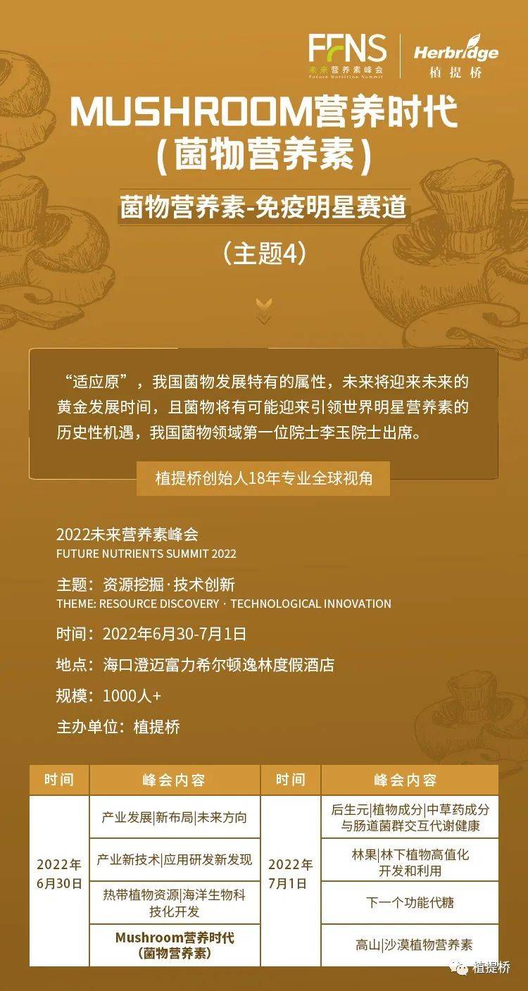 基于蘑菇这两年在海外市场持续大热,而我国又是食用菌大国同时在滋补食材灵芝方面有着悠久的使用历史,为了推动国内蘑菇产业链的深度开发应用。植提桥特于2022年6月30-7月1日在海南举办2022未来营养素峰会,该大会以资源挖掘和技术创新为主题。